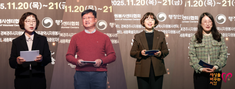 2025년 11월, 경주에서 제22회 대한민국자원봉사센터대회가 개최되었습니다. 그 중 관리자들의 이야기를 직접 들어보는 '세상을 바꾸는 시간V' 코너가 있었는데요. 4명의 자원봉사센터 관리자의 진심 담긴 사연을 들을 수 있는 시간이었습니다. 전국에서 모인 500여 명의 자원봉사센터 동료 관리자들에게 어떤 이야기를 들려주었는지 전해드립니다.... 보러가기🔍